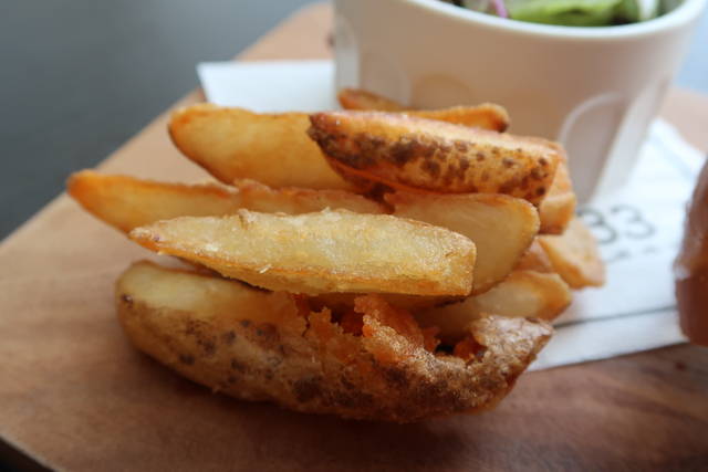 付け合わせのポテトは表面がバリバリに揚げてあって、