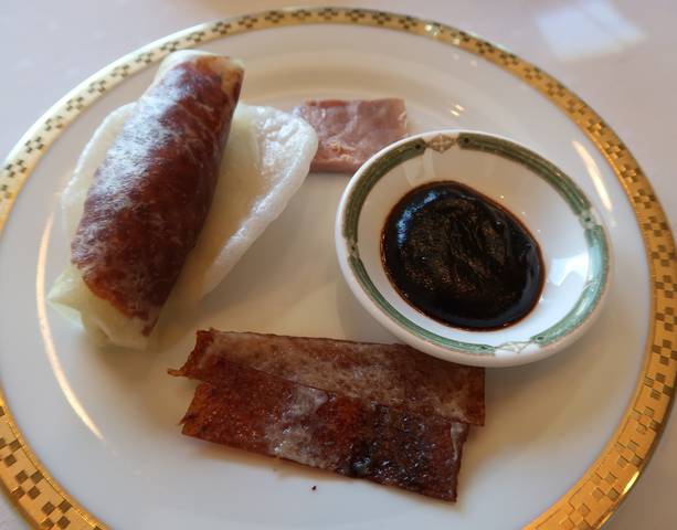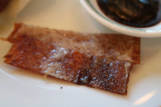 北京ダックが透けて見えるほどの薄いクレープで包まれ、下にはえびせん。