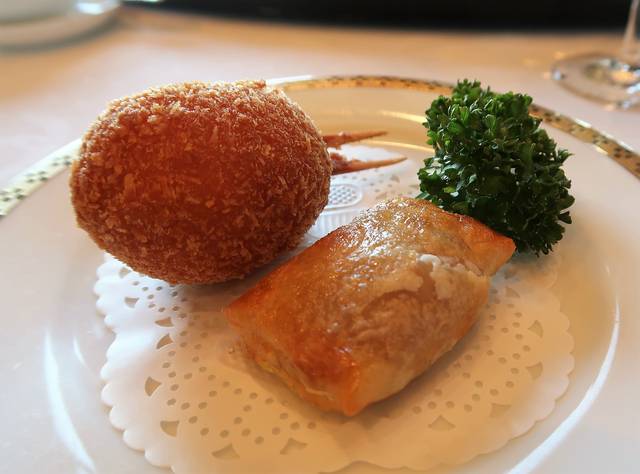 「チャーシューパイとかに爪フライ レモンソース添え」