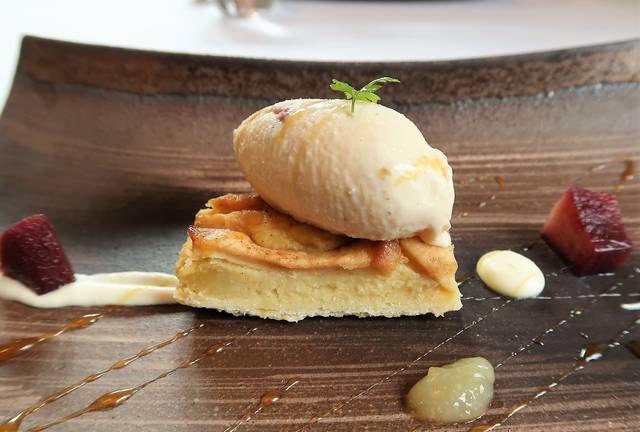 赤ワインのりんごのコンポート、キャラメルソース、レモンのムース、レモンのジャムみたいなもの。