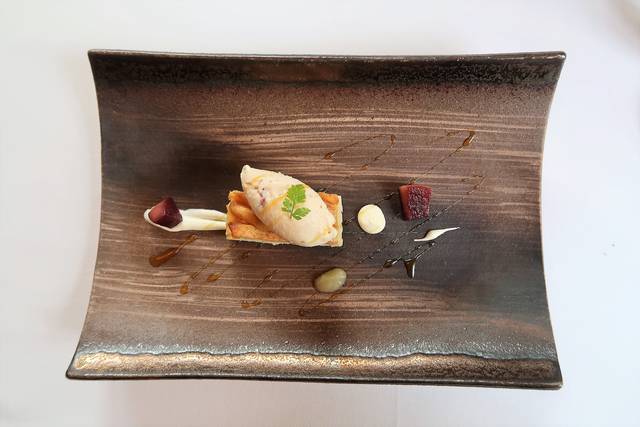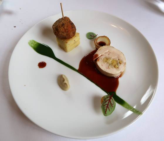 但馬あじ鶏胸肉と栗のバロティーヌ ひき肉のクロケット レフォールのソース