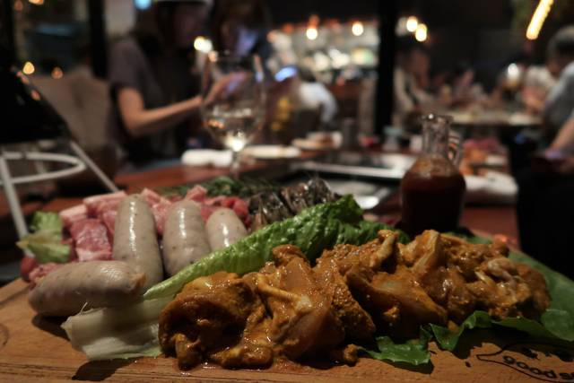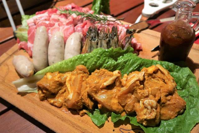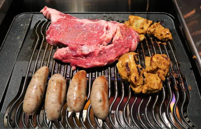 国産牛ロース、ガリシア豚方ロース、ふもと鶏のタンドリーチキン、有頭海老、ソーセージ。
