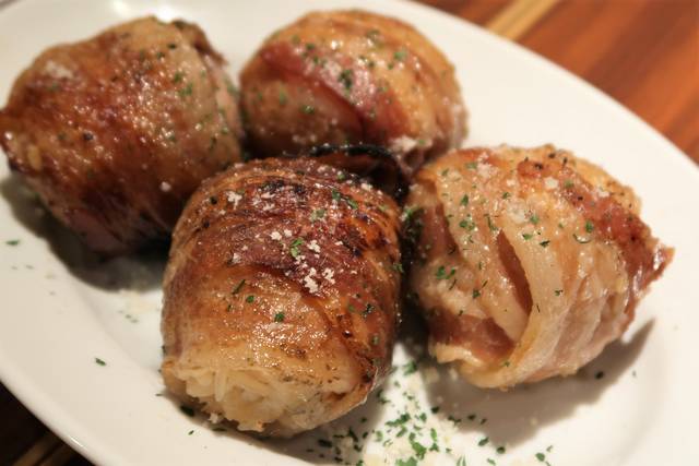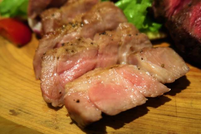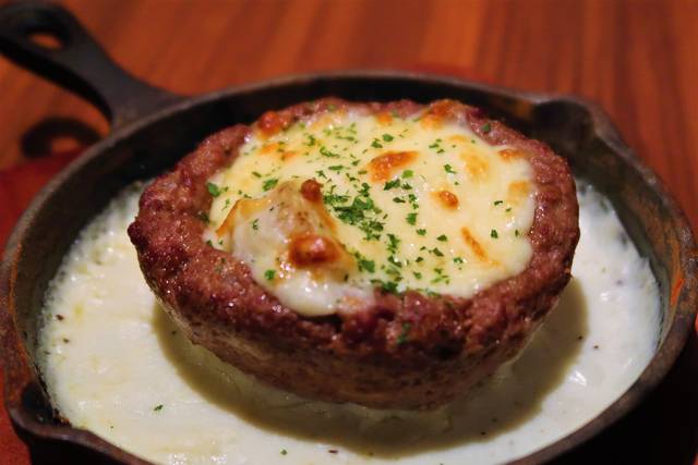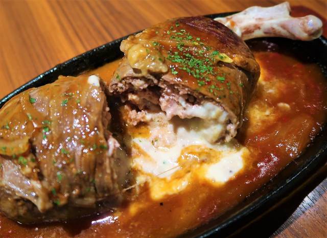 牛バラ肉でぐるっと巻いてあるハンバーグに豚バラの骨を刺したもの。