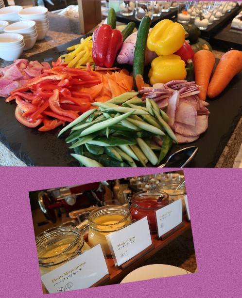 色鮮やかな野菜と、ドレッシングが4種類。マンゴードレッシングがフルーティで好きでした。
