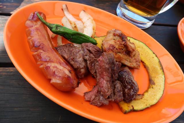 牛はハラミだからしっかり食べごたえがあり、チキンはタンドリー風ピリ辛。ソーセージはプキッと弾けるまで焼くのが好み。