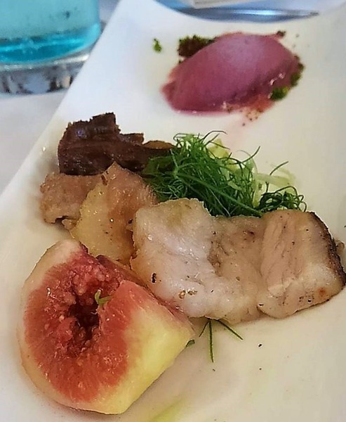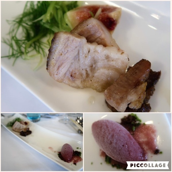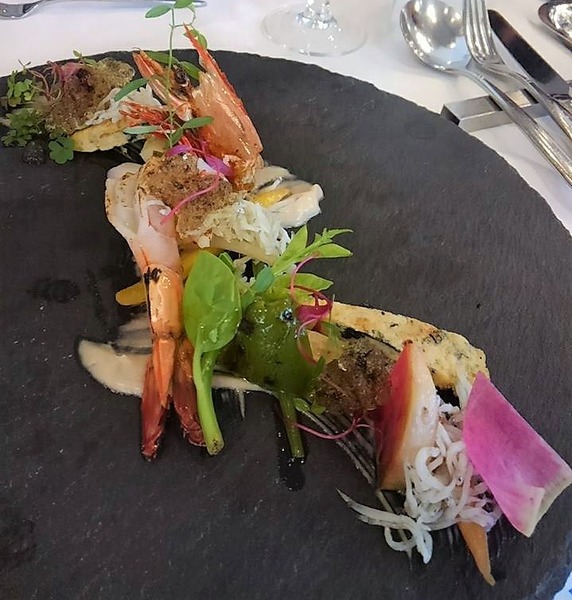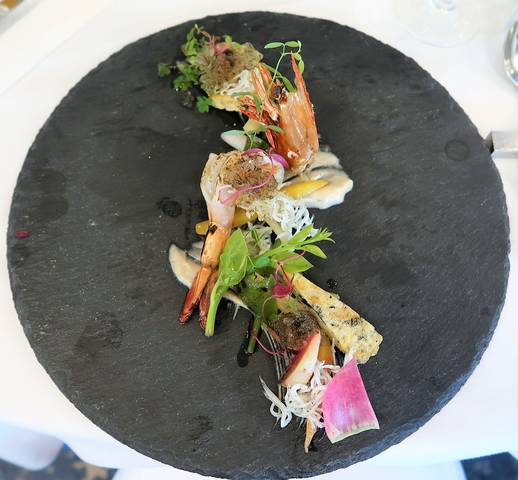 バーニャのソースが白波。野草・黄色い島人参・ツルムラサキ・紅芯大根などを彩りよく。大きな海老、しらす、海苔のジュレで磯の風味。大きな有頭海老の殻は素揚げされていて、バリバリ全部食べられました。食べるのがもったいなかったな~。