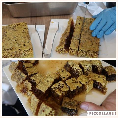 蜂は2km以上飛べないので、淡路島の蜂は純粋な和のミツバチなのだそうです。春の新しい花粉から作られる巣は白っぽくて高級☆ 秋にとれる蜂の巣は、400種類もの花の花粉が混じって黒っぽくなるのだそうです。