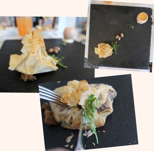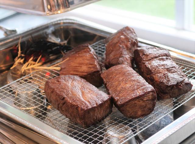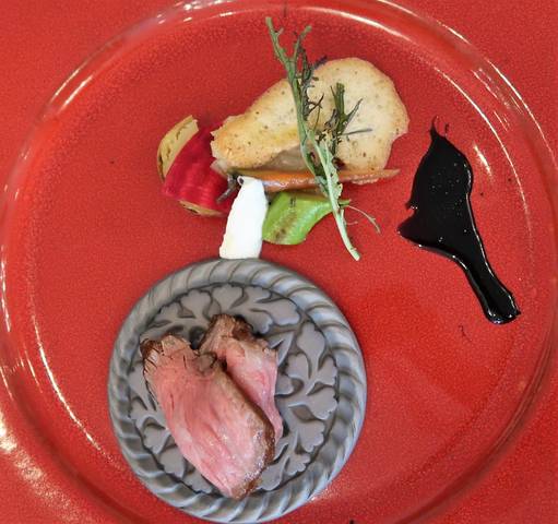 お肉料理は、「瓦にのった椚座牛の藁焼き おのころ塩のムース」