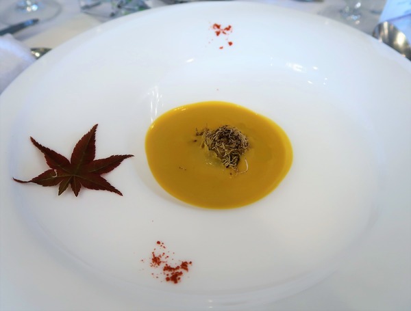 あま~いカボチャのポタージュに、栗に見立てた合鴨のお団子をシェフが一人ずつサービス。