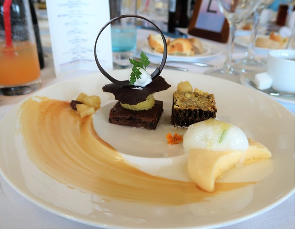 右手前の三日月型のアプリコットムースはセトレの形。ライムジンジャーの泡。サツマイモのケーキは淡路島。その間を巣蜜でつないで友好を表しています。エディブルのオレンジの小花がかわいくこぼれている♡