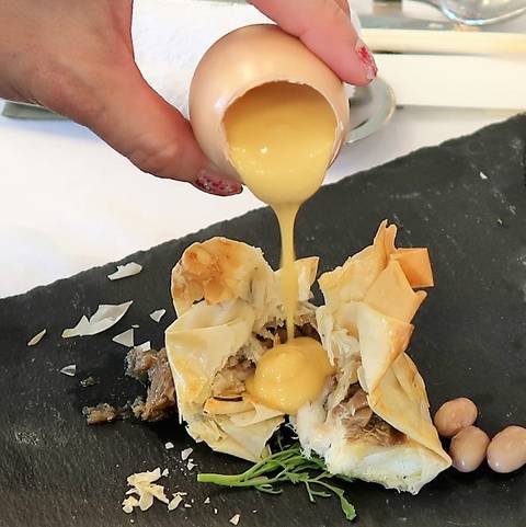 親鳥の身と子の卵を使ったパスタ。ナスタチウムの葉っぱ。