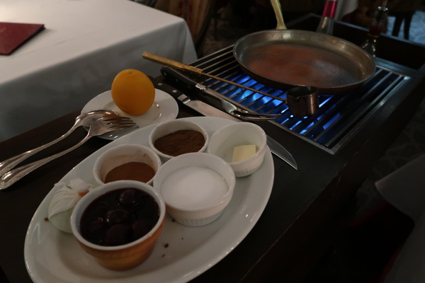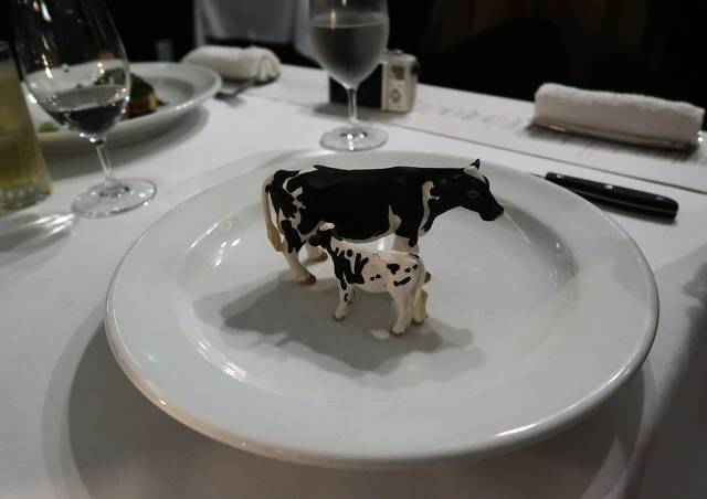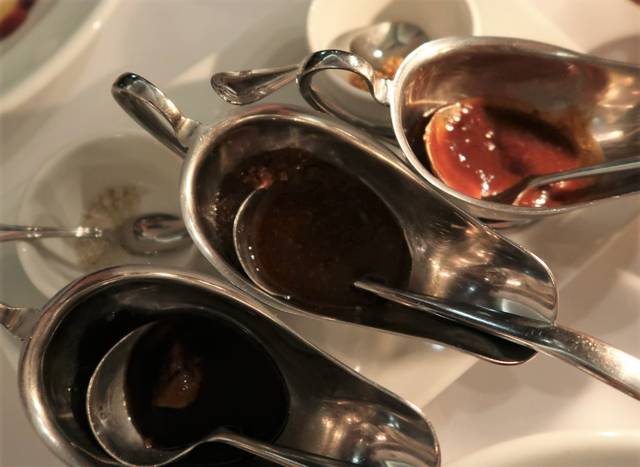 ローストガーリックのデミグラスソース、篠山の玉ねぎを使った和風ソース、牡蠣醤油のソース、タスマニアマスタード、黒トリュフ塩。