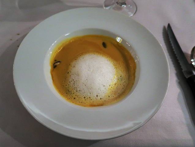 まったり甘いかぼちゃのポタージュに、桜のチップでスモークしたミルクの泡!