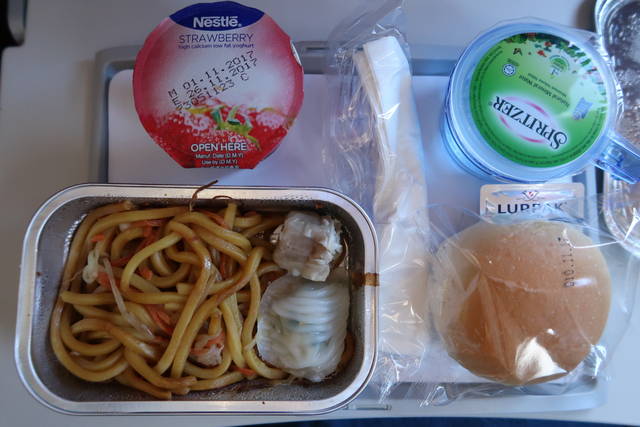 あまり味のない焼きそば、ニラ餃子、シュウマイ。