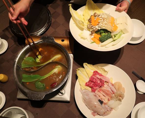 野菜類は、白菜・きのこなどのおなじみの野菜から、中国料理らしく青梗菜があって、人参は蝶やエビの形。アスパラガスをお鍋に入れるのは珍しいね?