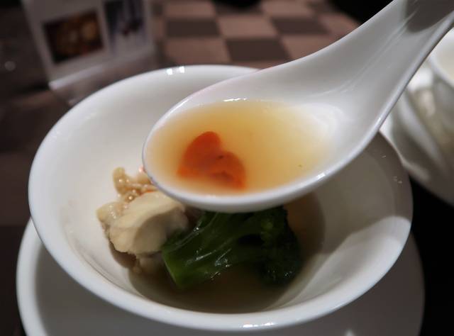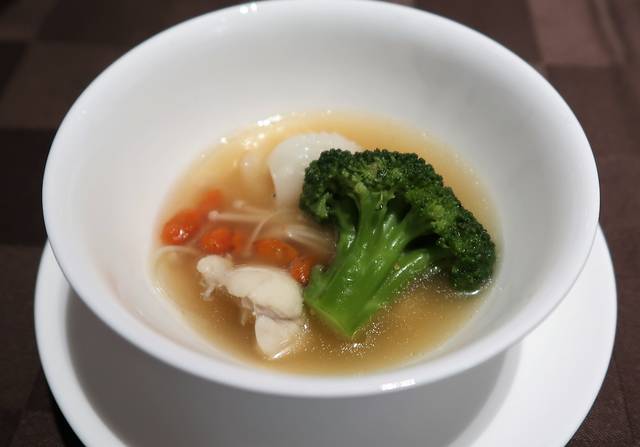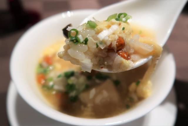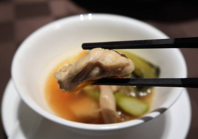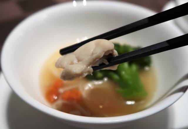 ふぐの身は淡泊だからしっかりとした中華スープで食べると美味しい!
