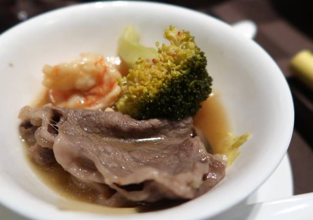 まずは、ふぐとえびなど海鮮とお野菜だけで。