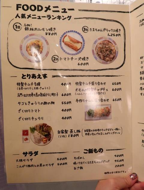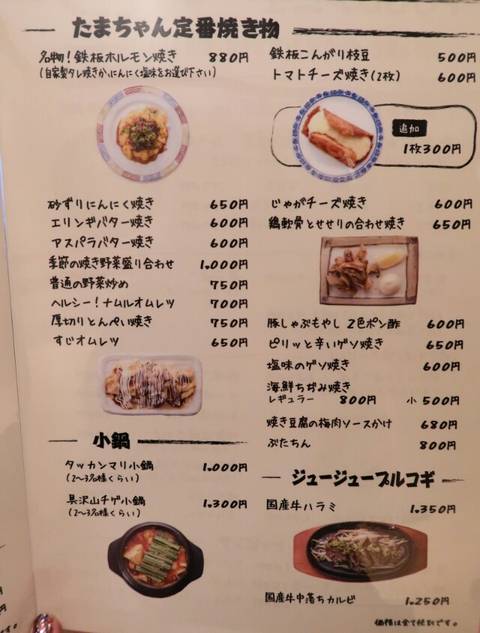 オモニの味の韓国料理や鉄板焼きを食べて飲み、お好み焼きや焼きそばで〆るのがたまちゃん流。