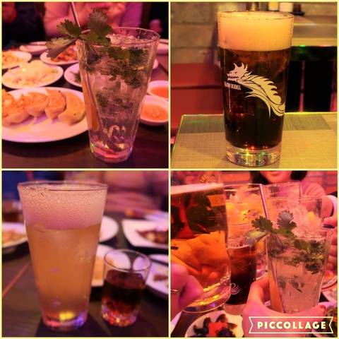 ドラゴンのプリントされたグラスでドラゴンハイボール(紹興酒のカクテル)¥420、パクチーサワー¥500でアジアン気分!
