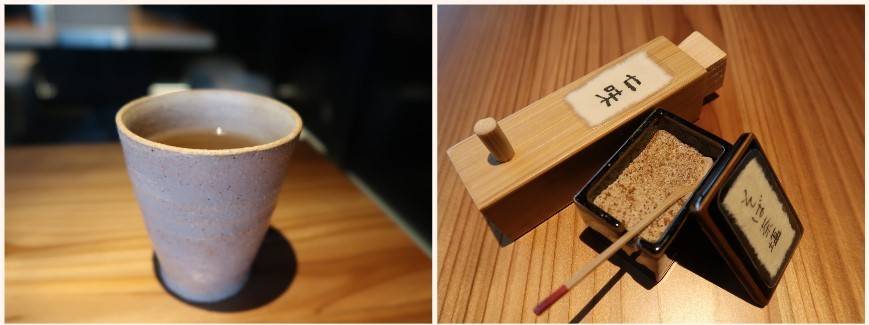 そば茶が素焼きのコップで。