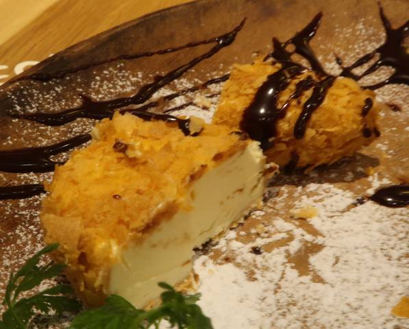 カットしたらアイスでした。とんかつソースに見えるのはチョコソースで、パン粉のかわりにパイ生地。