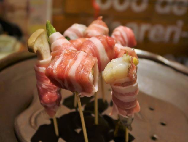 プチトマト、エリンギ、ズッキーニ、玉ねぎ、うずら玉子、インカのめざめ(じゃがいも)、ヤングコーン、グリーンアスパラ、海老、チーズをそれぞれ「なにわポーク」で巻いて串に刺したもの。