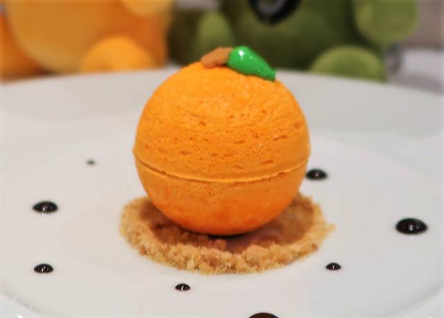 炭酸みかん、みかんのジュレと共にメレンゲのみかんの中に入っています。