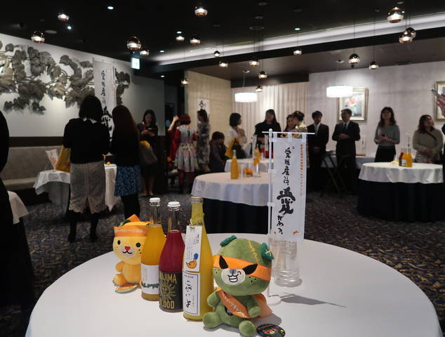 ゆるキャラの「みきゃん」と「ダークみきゃん」に囲まれる、佐々木シェフ、王理恵さん(野菜ソムリエ)、愛媛県の方。