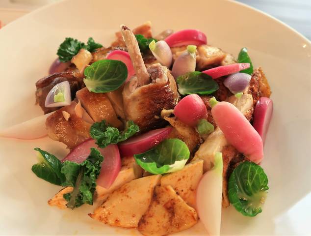 鴨が分厚い~☆あぶったみかんが甘すぎてびっくり。鴨とオレンジはそもそも相性が良いとされていますが。シュレッドされたお野菜の色がリンクしていてキレイ。