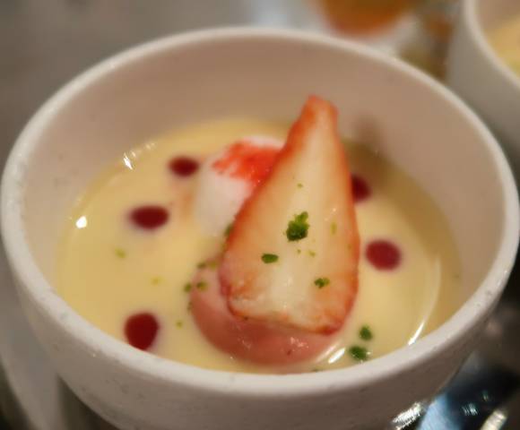 カラメル風味のアングレーズソースにうっとり。愛媛の苺「赤い雫」のシャーベット、メレンゲの上にリヨン風の赤いアーモンドプラリネ、いちごのクリームといちご。