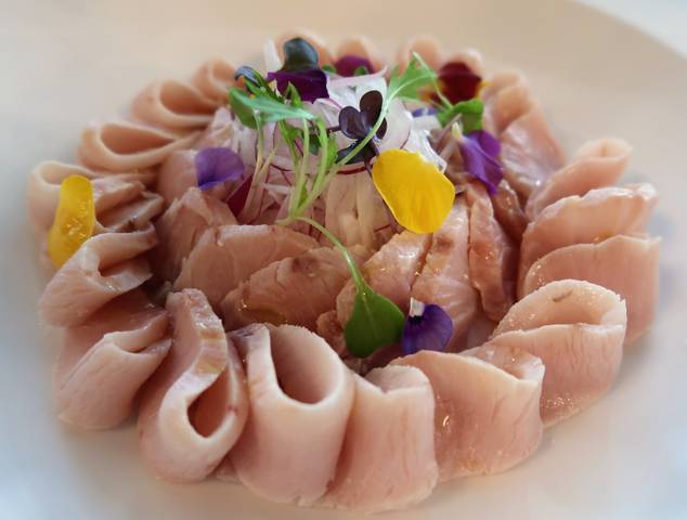 さっとお湯に通した脂と旨みがたっぷりのっているブリ、ブリトロ??柑橘のドレッシングでフレンチの味わい。