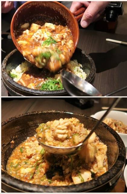 苫小牧のたらの白子マーボーあんをたっぷりかけて、ざっと混ぜて器に移したのち、