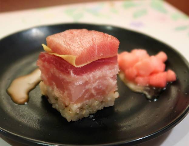 トロ、薄焼き卵、赤身、ねぎとろ、びんちょう、混ぜご飯と、豪華なミルフィーユ仕立て!