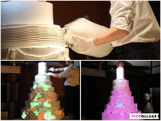 プロジェクションマッピングを使っての、苺のデコレーションパフォーマンスでした。高さmを超える巨大ケーキに、シェフがめちゃ重そうな袋に入った練乳クリームを絞り出し、デコレーションします。最後にいちごをたっぷり飾って完成☆