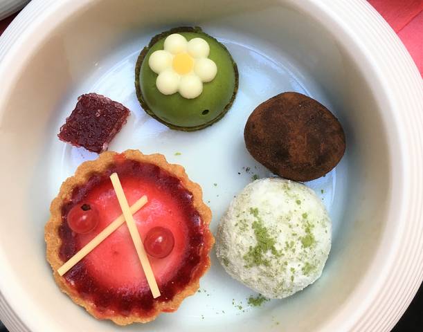 苺のチーズタルト、苺のゼリー、苺のトリュフチョコレート、抹茶のサブレ、抹茶のムース。お花がかわいい。