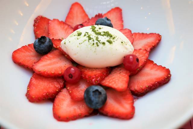 苺がお花のように並べられていて、かわいいこちらのスイーツは、抹茶のパンナコッタ。