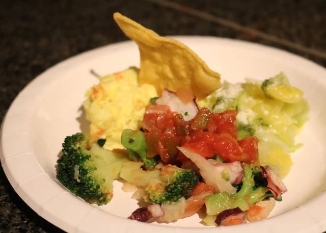 タコとセロリのトマトサルサマリネ、インカのジャーマンポテト、サラダなど。