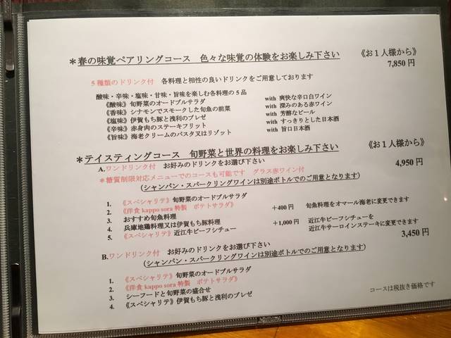 「酸味・香味・塩味・辛味・旨味」を愉しむ5品に、相性の良い醸造酒を合わせた「春の味覚ペアリングコース」¥7850をいただきました。
