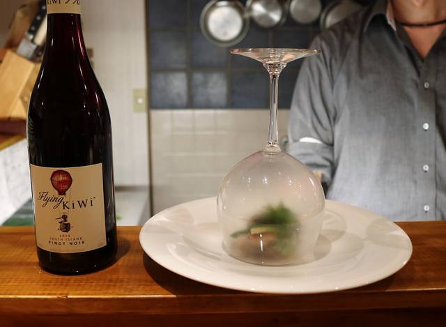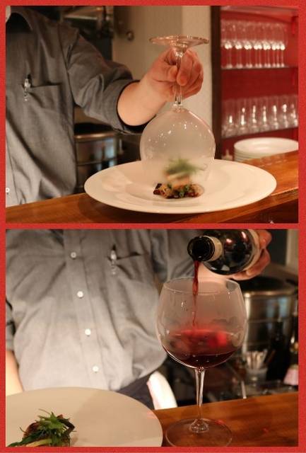 お料理にグラスを逆さにかぶせて煙を閉じ込め、開けたグラスに、