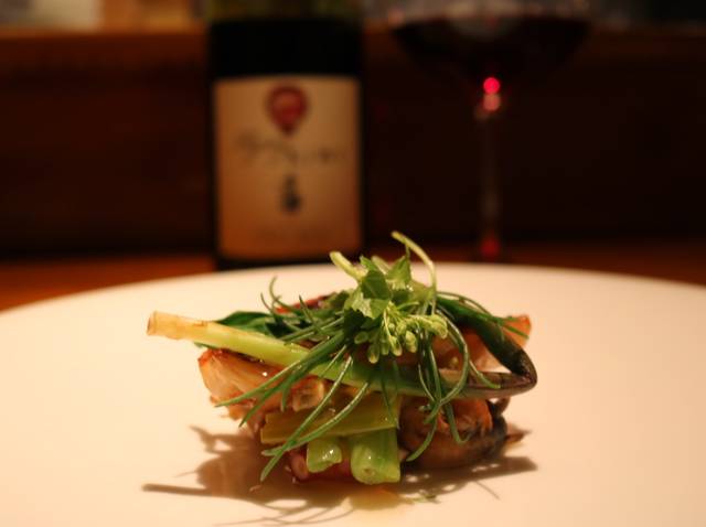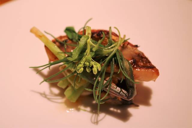 貝からとったダシにナンプラーとスイートチリを合わせ、つぶ貝をエスニックな味わいに。タコはクミンの香り。アサリ。八尾の若ゴボウはサブジに。花ワサビ、行者ニンニク、オカヒジキ。