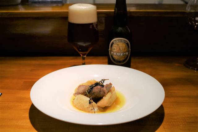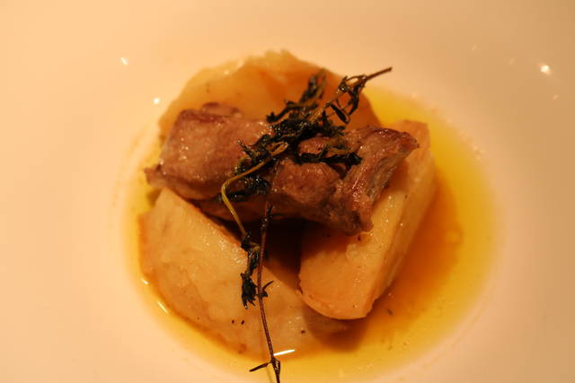 ムール貝やアサリなどからとった貝のダシで、伊賀のもち豚とじゃがいもを、ハーブやスパイスで煮込んだお料理。あぁ、クミンの香り。お肉に弾力があり美味しい!