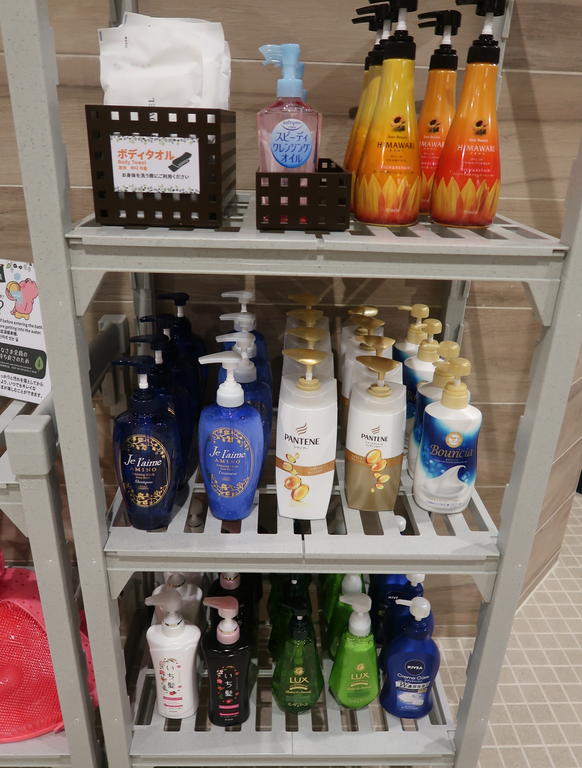 ポーラのシャンプーなどが設置してあるけれど、お好みで別のメーカーのものも使えるよ。