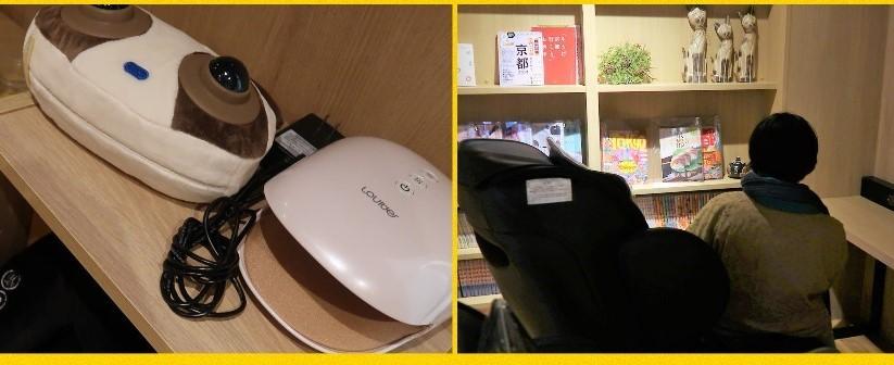 最新式マッサージチェア、癒しグッズ、雑誌や漫画などでリラックス。