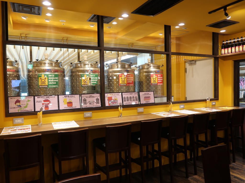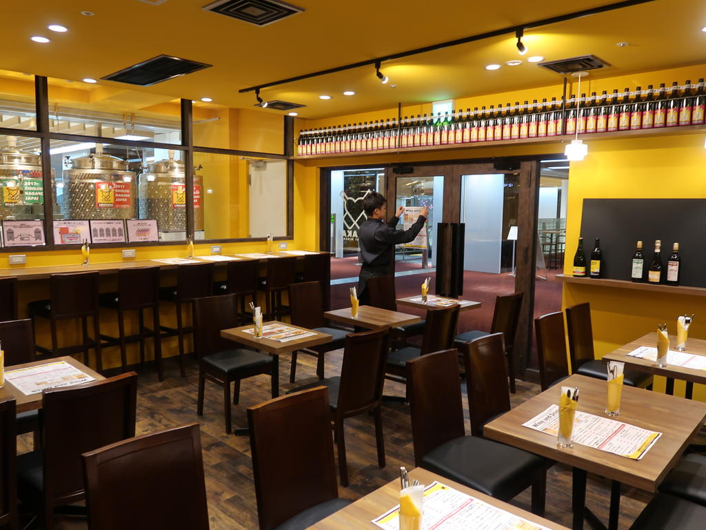 黄色い天井と壁、ウッディな床。容器なイタリアンバルという感じ。
