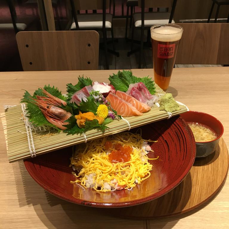 海の幸たっぷりお刺身どんぶり¥1800 大阪エアポートビール¥800