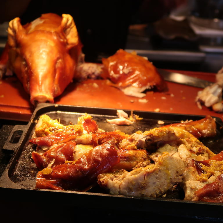 インパクトのあるメイン料理!子豚をグルグルと回転させながらロースト。皮もふつうに食べられます。野生の味わい、肉質はジューシー。