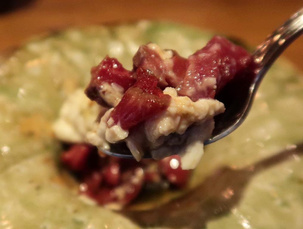 ちょっと甘くてごま油香るタレにからめられたレア~な感じの炙ったお肉にを短冊状に切ったものがスレンドです。ユッケ風の味わい。