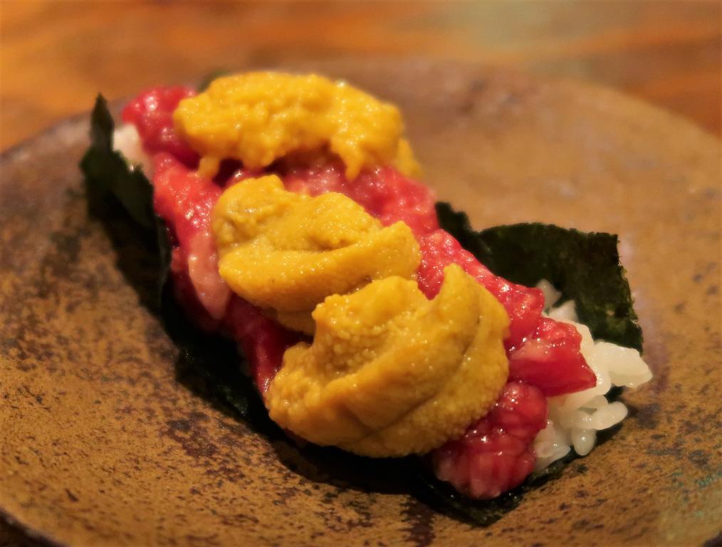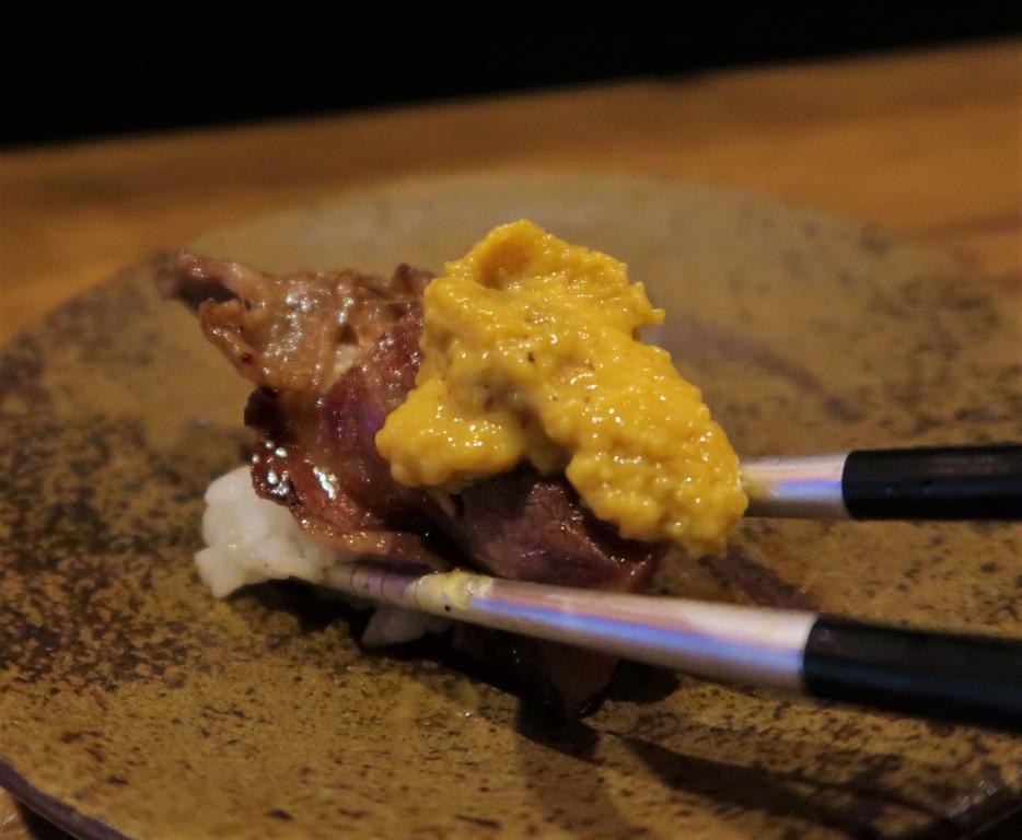 炙った海苔にごはん。スレンドのとろんとした甘いお肉が、雲丹と一緒にとろける~♪