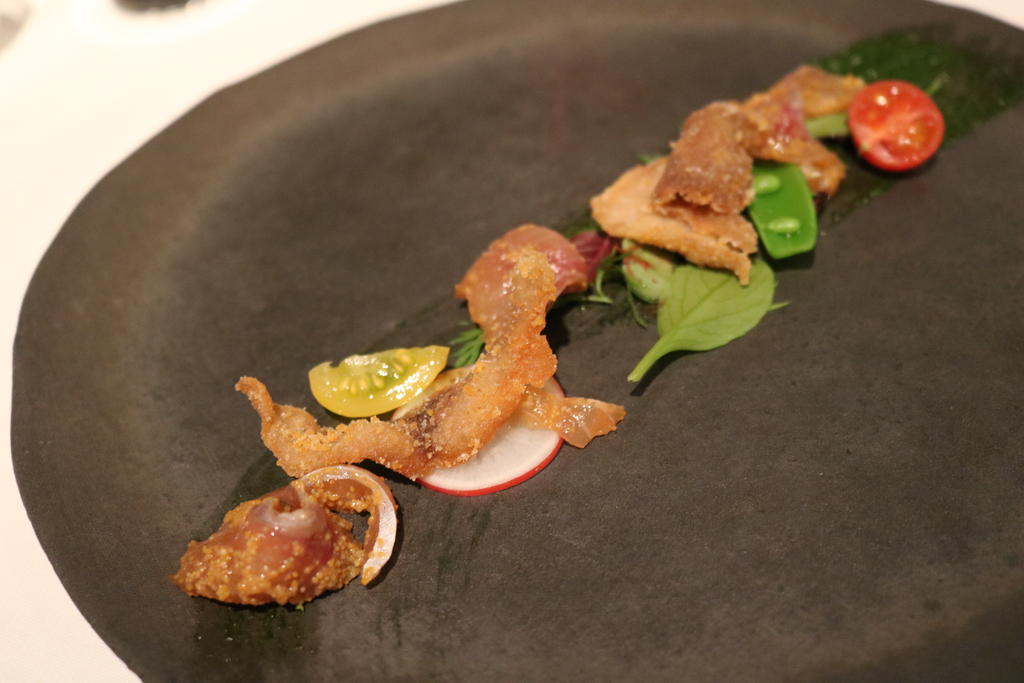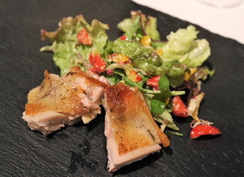 お肉料理は「近江軍鶏のコンフィ 春野菜のメスクランサラダ」