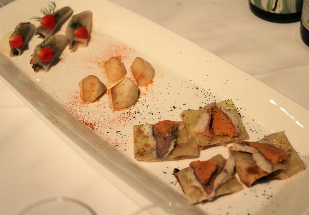 「浪乃音 大吟醸 金井泰一流」には、「蛍烏賊と春野菜のぬた和え 白味噌とクリームチーズ」